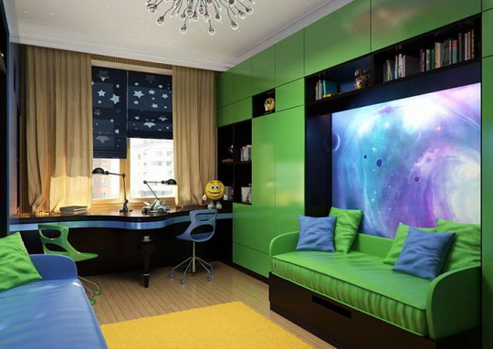 - Синий, голубой и зеленый цвета затемняют комнату, визуально уменьшают ее пространство. Не смотря на то, что эти цвета считаются классическими для мальчиков, не стоит использовать их в маленьких и недостаточно освещенных комнатах.